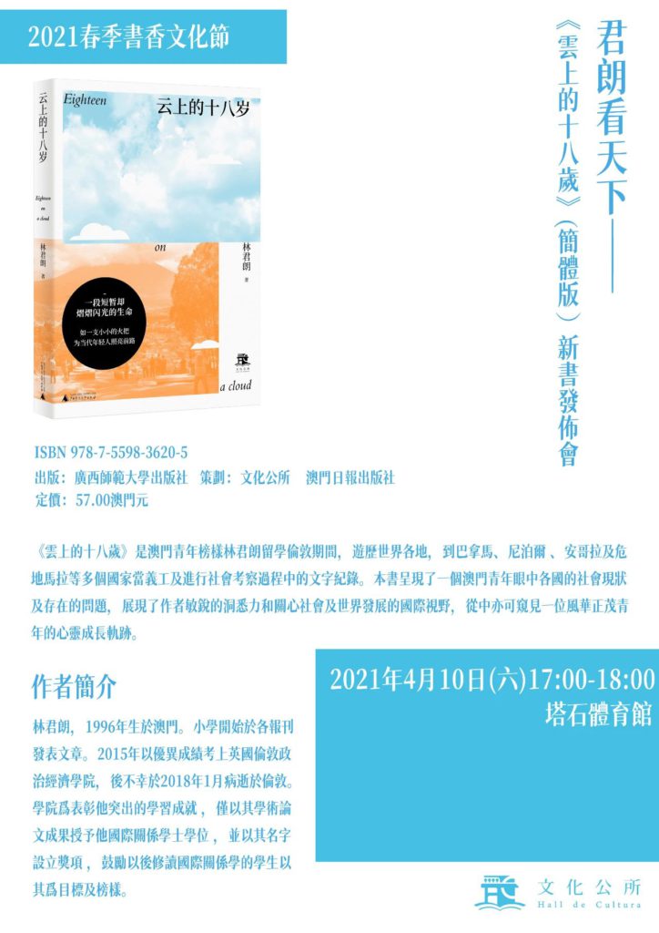 四月十日(六)下午五點,塔石體育館的春季書香文化節,將舉辦一場“君朗看天下——《雲上的十八歲》(簡體版)新書發佈會”。聽撰序人之一李展鵬帶大家讀一遍書中精華,或許會有更深體會。
