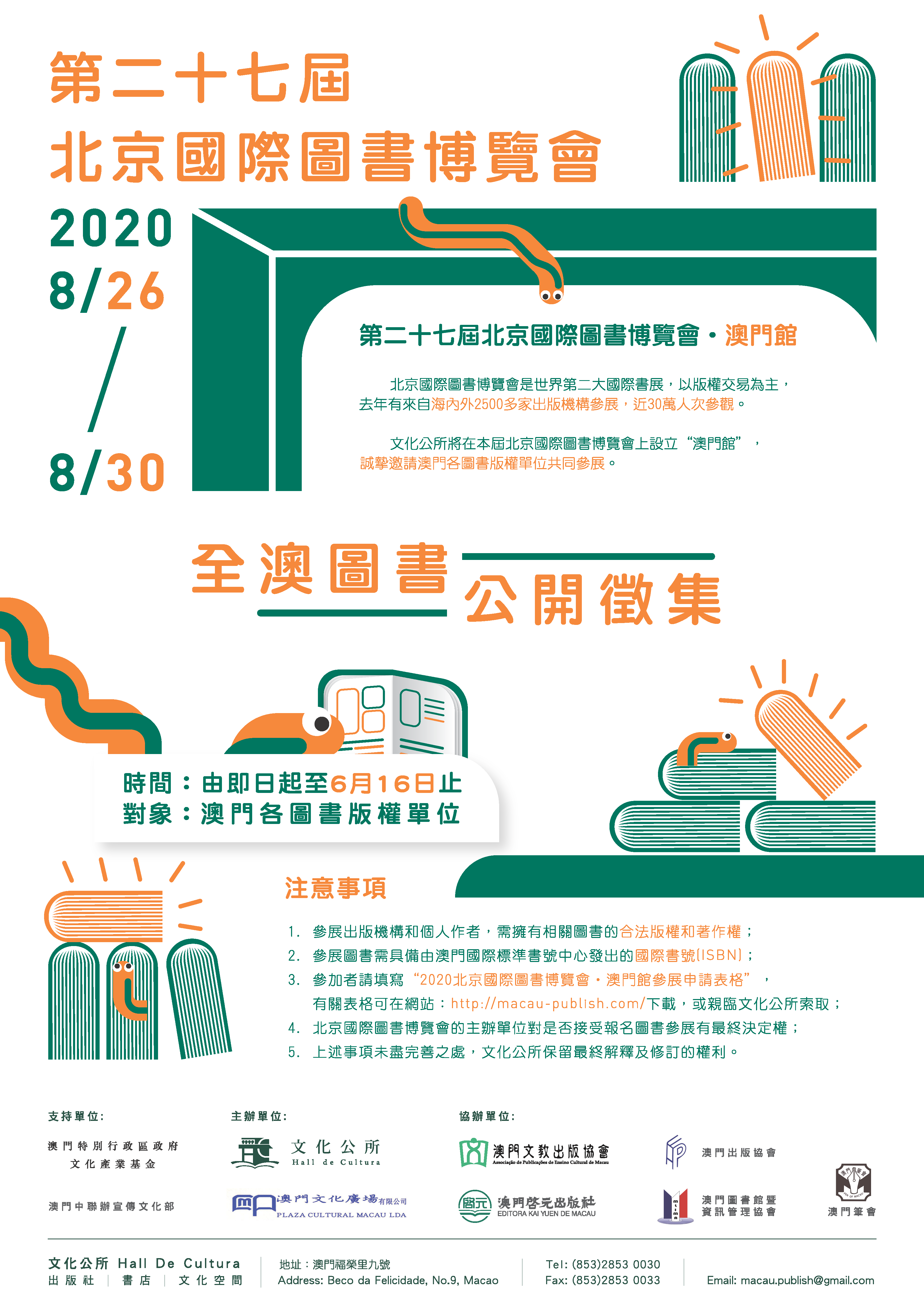 第廿七屆北京國際圖書博覽會將於八月廿六至三十日在北京舉行,文化公所聯同文化廣場等多家單位,現正公開徵集澳門圖書參展,屆時於會場搭建的“澳門館”集中展示本地圖書。徵集活動截至本月十六日,至昨日止,共收到十個單位提交參加表格。