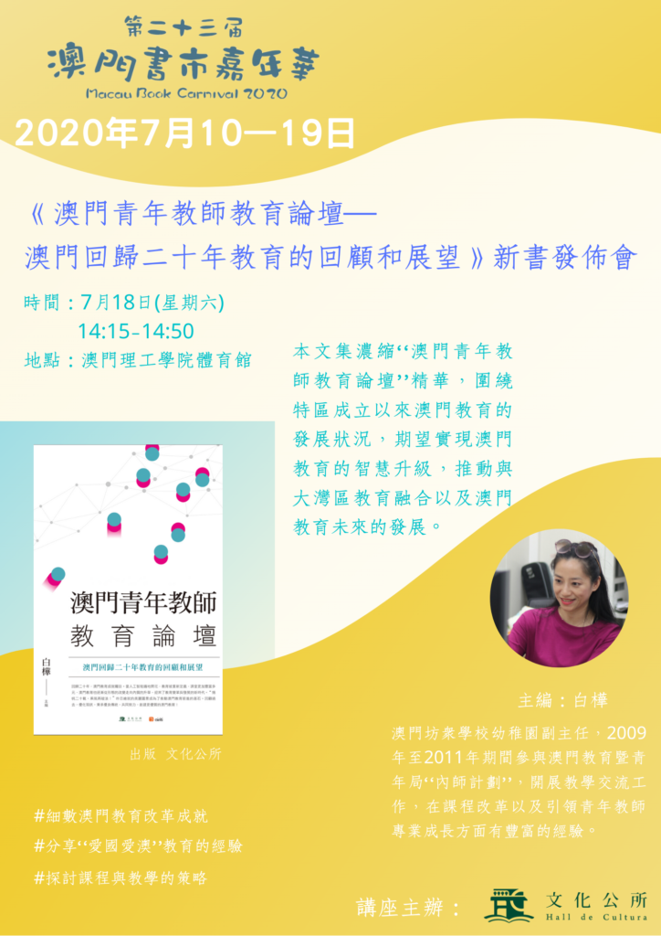 《澳門青年教師教育論壇——澳門回歸二十年教育的回顧和展望》現於文化公所、文化廣場、星光書店、一書齋、慢調書旅、活力文化及珠新書店有售。適逢七月澳門書市嘉年華,文化公所將於本月十八日下午二時十五分至二時五十分,在理工體育館舉行新書發佈會,歡迎各界人士出席。